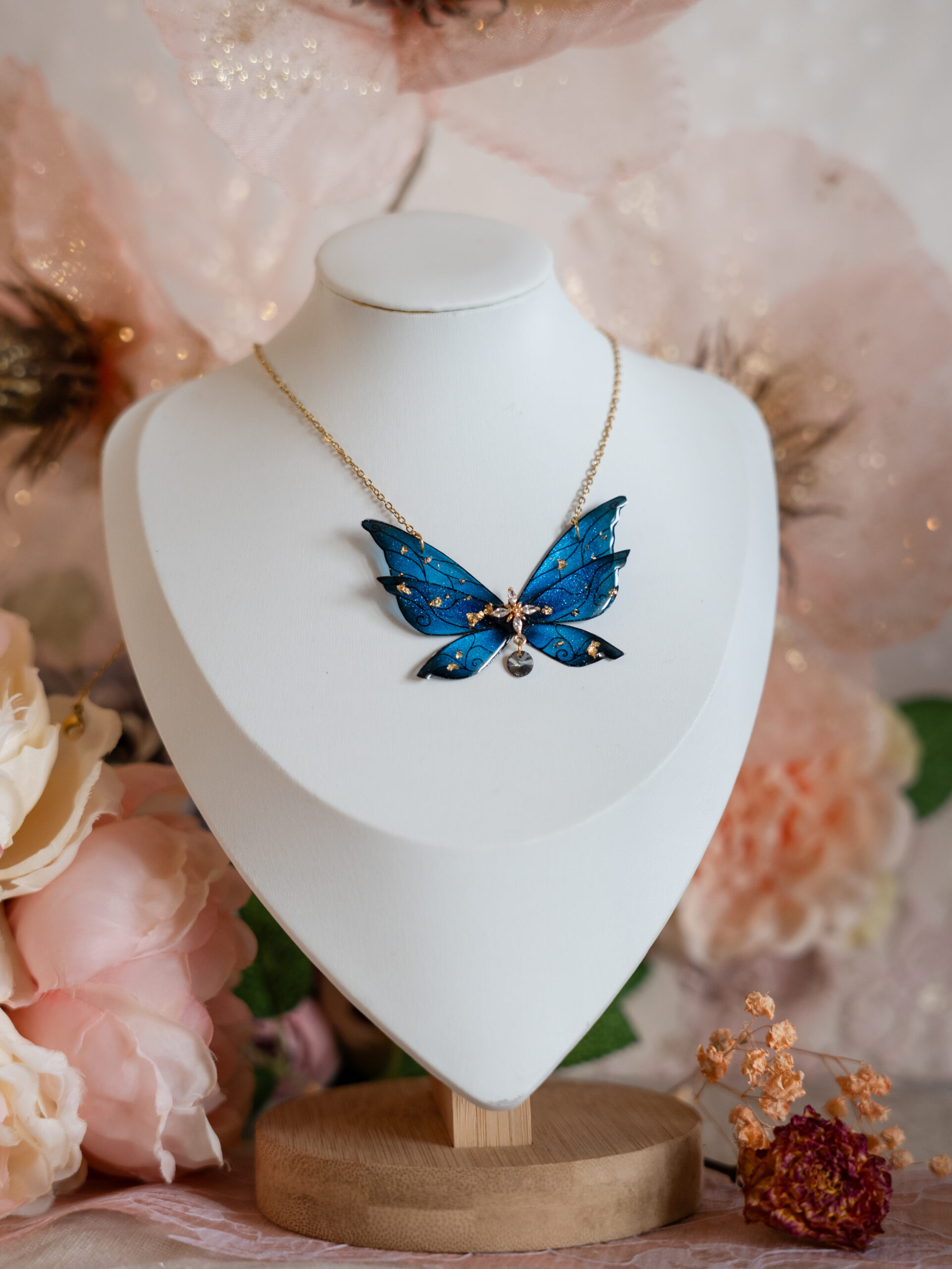 La nuit tombe sur les ailes de cette fée, les éclats dorées parsèment le ciel  , une étoile  délicate brille en son centre à laquelle est accrochée un pendentif en verre noir