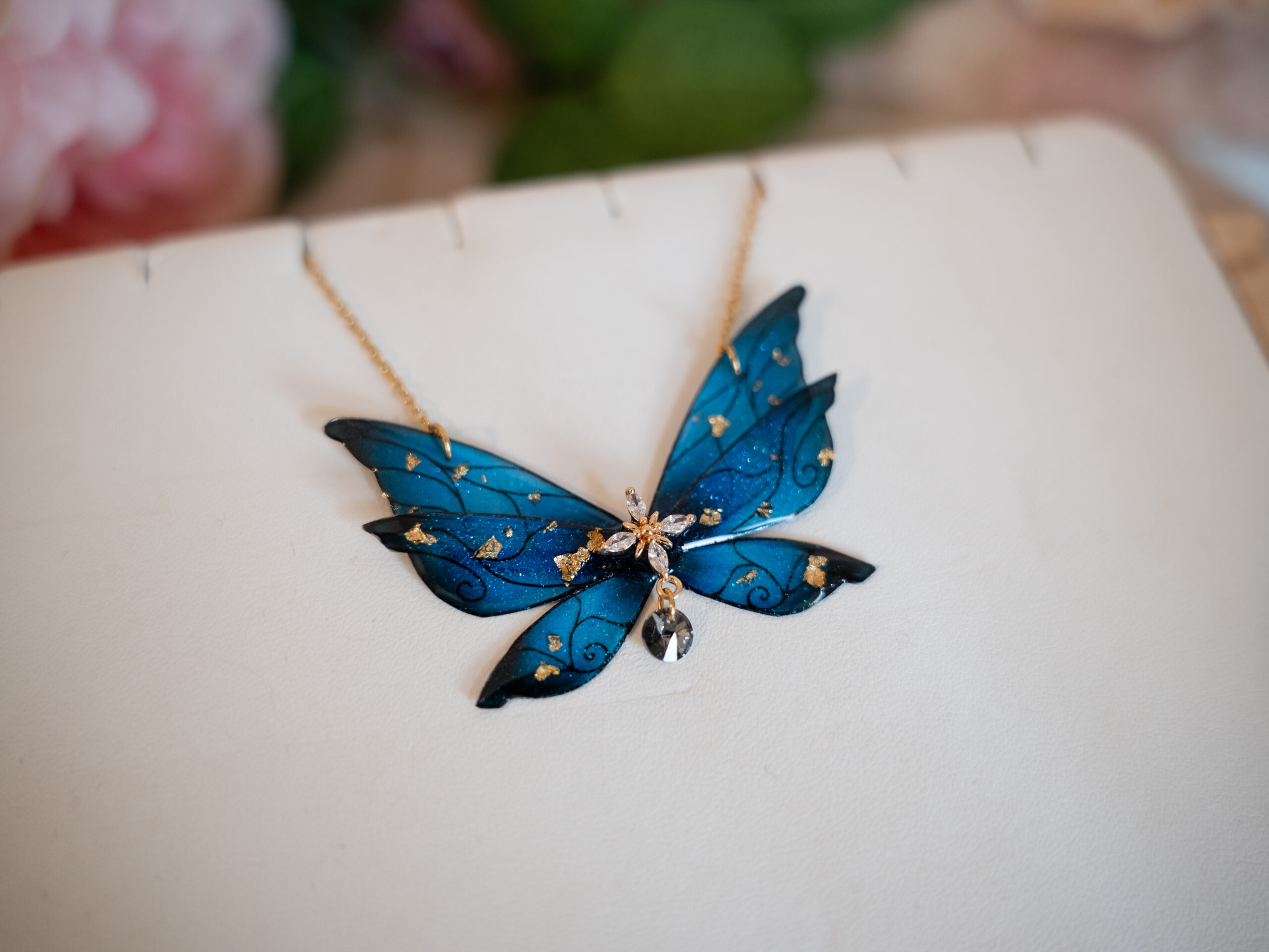 les ailes sont en résine et sont entièrement réalisées artisanalement , par mes soins. Faites à la main , elles sont toutes uniques et il peut y avoir de légères différences, notamment pour les paillettes.
